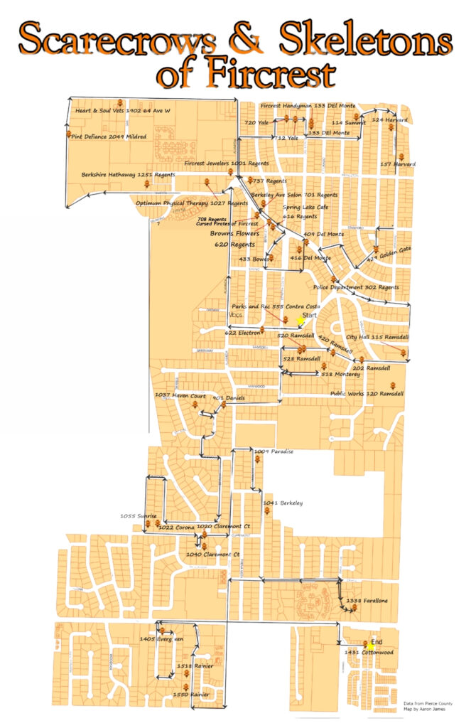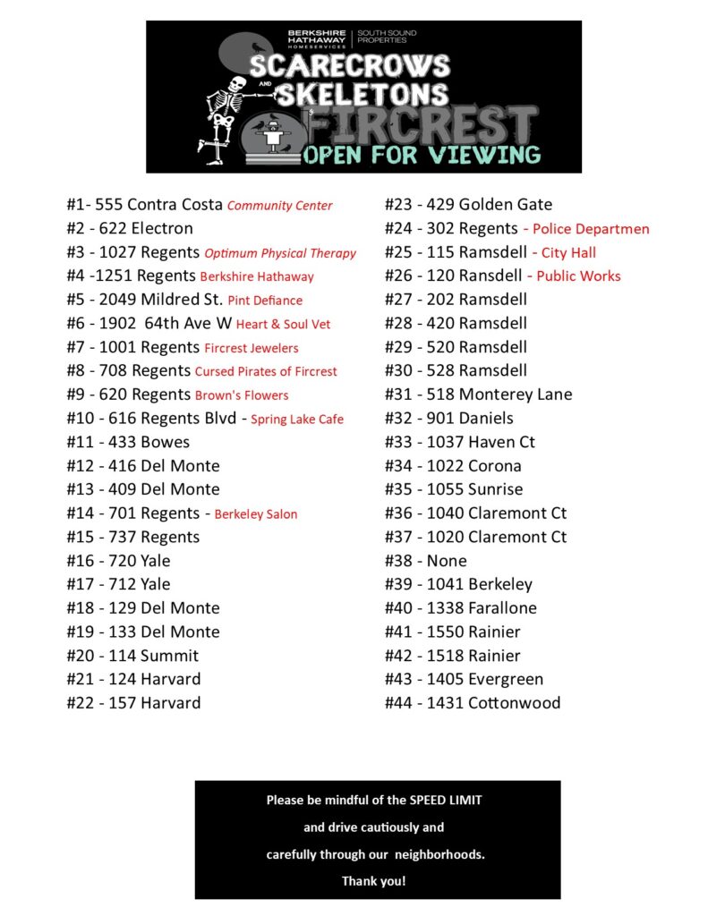 Have you checked out the Scarecrows and Skeletons of Fircrest tour yet? There are lots of really cool displays around town! And it doesn’t need to be a driving tour! Put on your walking shoes, choose a neighborhood and enjoy the route on foot! You’ll be sure to see lots of other fun Halloween decor too!