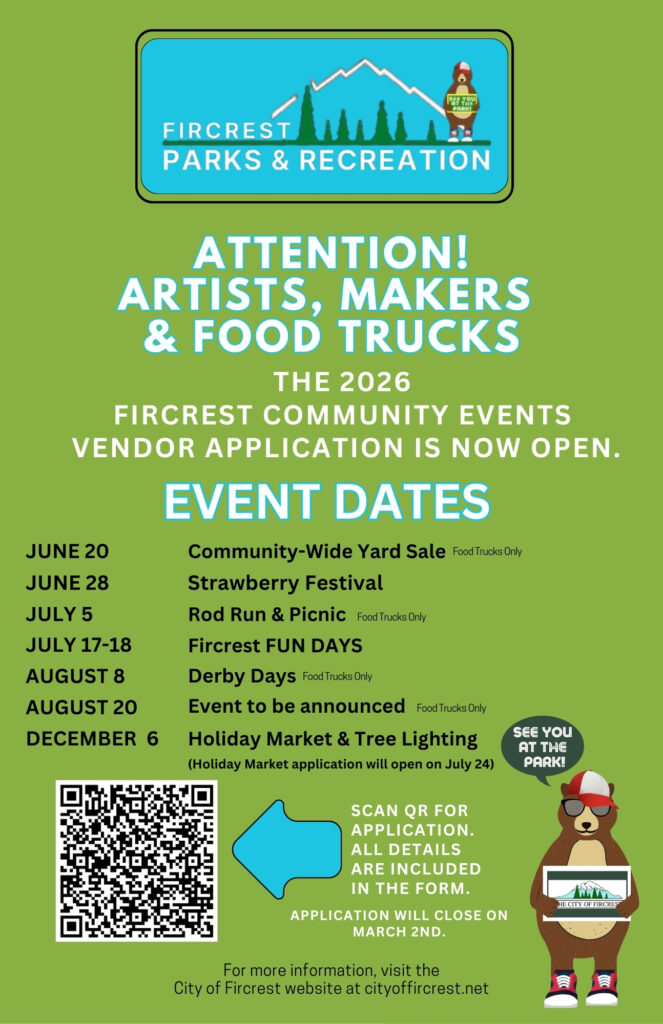 The City of Fircrest Parks and Recreation offer multiple events throughout the year that include vending opportunities for artists, crafters, food trucks and educational vendors.