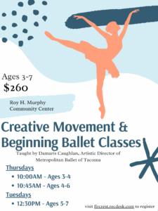 Taught by Damaris Caughlan-Artistic Director, Metropolitan Ballet of Tacoma. Her approach and style with teaching young dancers is to help them express their inner joy of movement. Ms. Caughlan introduces disciplines such as self control, listening skills, and patience along with basic ballet fun in this wonderfully creative class.