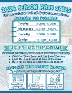 - Resident Family Season Passes are available at the Roy H. Murphy Community Center.