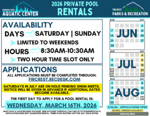 The Edwards Family Main Pool rental applications will open to the public Monday March 16th at 12:00 pm. Private rentals are only available on Saturdays and Sundays from 8:30AM-10:30AM between May 6th and Aug 30th, 2026. Saturdays in July are currently on hold pending scheduling for the FAST Swim Team’s Swim Meets. There is no waiting list available for these dates. Once the Swim Meets are scheduled, notice will be given in advance of additional dates becoming available to apply for.